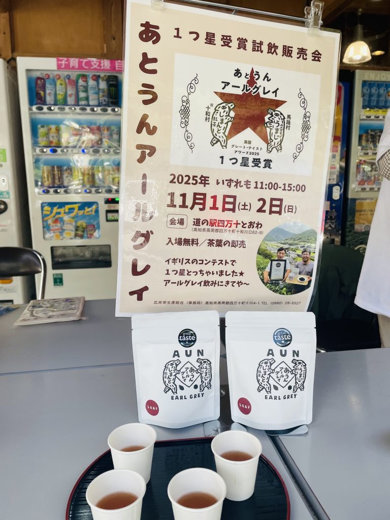 去る2025年11月1日(土)・2日(日)、あとうんアールグレイ1つ星受賞!を記念し、道の駅四万十とおわ(高知県高岡郡四万十町十和川口62‐9)にて試飲販売会を実施。広井茶生産組合の茶農家自らが、お客様の目の前でアールグレイを淹れ、商品への思いやおススメポイントなどを伝えながらの接客で、県内外のお客様においしい時間を演出した。
