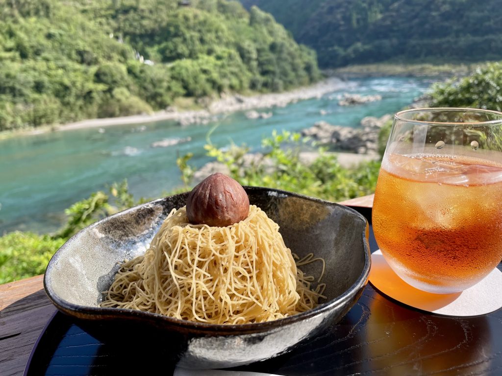 あとうんアールグレイ(1杯400円)をお店で味わえるのは、四万十ドラマ直営の高知県内カフェの「shimantoおちゃくりcafé」「SHIMANTO ZIGURI」。しぼりたての「しまんとプルミエモンブラン」とぜひセットでお召し上がりください。