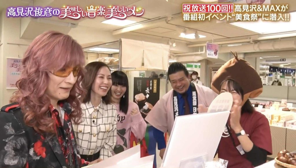 なんと今回の催事「高見沢メシ美食祭in日本橋三越」は、番組「高見沢俊彦の美味しい音楽美しいメシ」放送100回記念とのスペシャル企画も行われ、会期初日に高見沢氏ご本人、ゲストのMAX、ナレーションのロジャー氏(大自然)ご一行が会場に現れるというとんでもない内容で会場は熱気に包まれました。